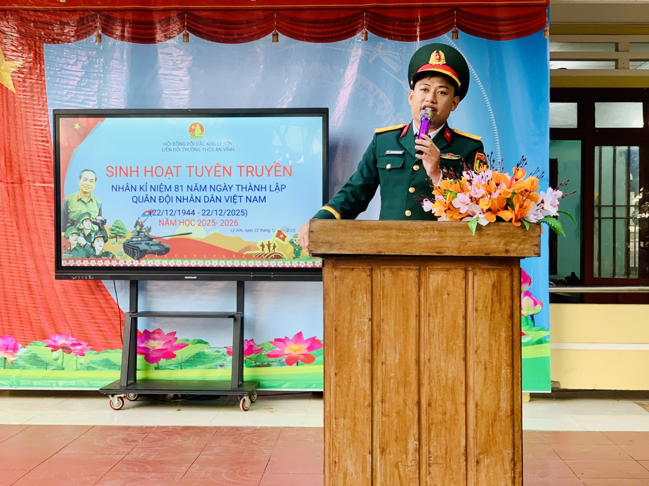 Trong không khí trang trọng và đầy tự hào của những ngày tháng 12 lịch sử, thực hiện chương trình kết nghĩa giữa Trường THCS An Vĩnh và Đại đội Pháo mặt đất – Đặc khu Lý Sơn, sáng thứ Hai, ngày 22/12/2025, tại sân Trường THCS An Vĩnh đã diễn ra hoạt động tuyên truyền, giáo dục truyền thống Quân đội nhân dân Việt Nam nhân kỷ niệm 81 năm Ngày thành lập Quân đội nhân dân Việt Nam (22/12/1944 – 22/12/2025) và ngày Hội Quốc phòng toàn dân (22/12/1989 – 22/12/2025).